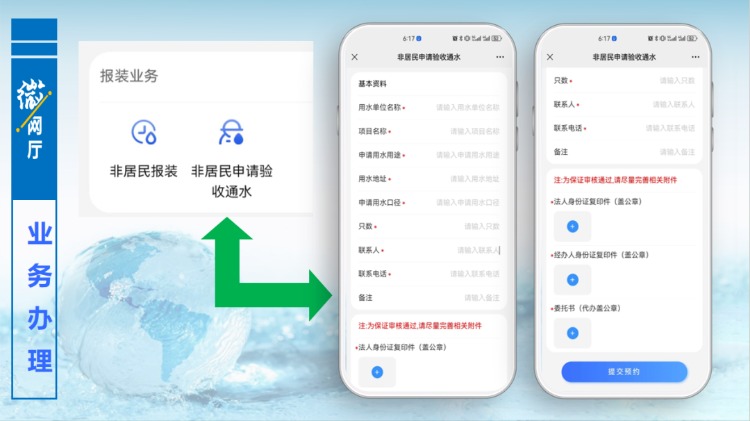 當(dāng)用水施工完成,達(dá)到通水條件,用戶同樣可在“微網(wǎng)廳”中,辦理驗(yàn)收通水申請(qǐng),填寫(xiě)相關(guān)信息,上傳附件,提交預(yù)約,后臺(tái)工作人員會(huì)主動(dòng)聯(lián)系用戶,進(jìn)行驗(yàn)收通水。