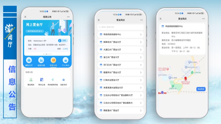 信息公告模塊對(duì)公司營(yíng)業(yè)網(wǎng)點(diǎn),停水通知,服務(wù)熱線等信息進(jìn)行公開(kāi)發(fā)布,后期我們將持續(xù)進(jìn)行更新。