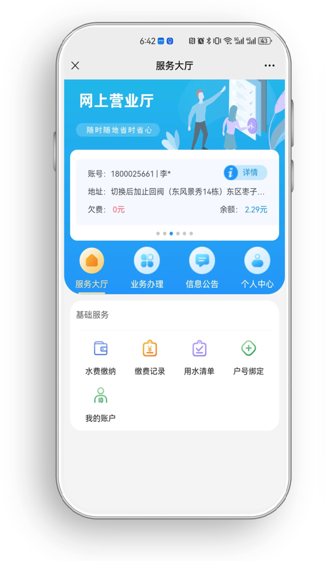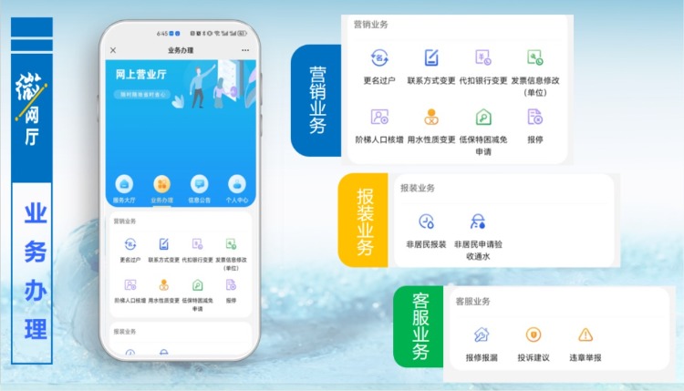 按照提示步驟,綁定用水開(kāi)戶賬號(hào)后,就能輕松便捷使用“微網(wǎng)廳”各項(xiàng)服務(wù)功能。用水開(kāi)戶賬號(hào)可查閱供水合同、服務(wù)短信或致電供水服務(wù)片區(qū)營(yíng)業(yè)服務(wù)熱線進(jìn)行查詢。