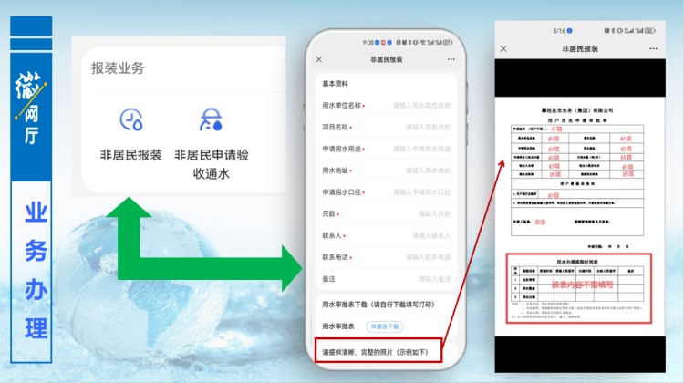 用戶可在報(bào)裝業(yè)務(wù)版塊中申請(qǐng)獲得用水。進(jìn)入報(bào)裝業(yè)務(wù)版塊,下載用水審批表,按照示例圖片,完善表格內(nèi)容,再拍照上傳,填寫(xiě)好相關(guān)信息及附件,提交預(yù)約后,由后臺(tái)工作人員接單,進(jìn)入辦理流程,流程完結(jié),告知申請(qǐng)人是否滿足接水條件,完成報(bào)裝申請(qǐng)。