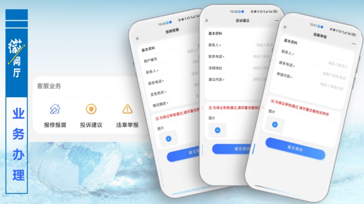 客服業(yè)務(wù)版塊主要是針對(duì)報(bào)修報(bào)漏,只要提交相關(guān)信息,工作人員會(huì)及時(shí)與用戶取得聯(lián)系進(jìn)行處理。“微網(wǎng)廳”已開(kāi)通投訴建議通道,對(duì)用戶提出的投訴和建議,將會(huì)第一時(shí)間進(jìn)行回復(fù)和處理,同時(shí)歡迎大家對(duì)身邊的違章用水現(xiàn)象進(jìn)行舉報(bào)。